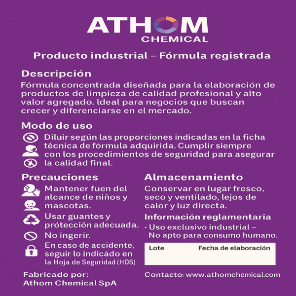 Hoy, como Athom Chemical, nos dedicamos 100% a entregar fórmulas químicas profesionales listas para fabricar, con respaldo técnico, contratos de uso y soporte para emprendedores, distribuidores y empresas del rubro.